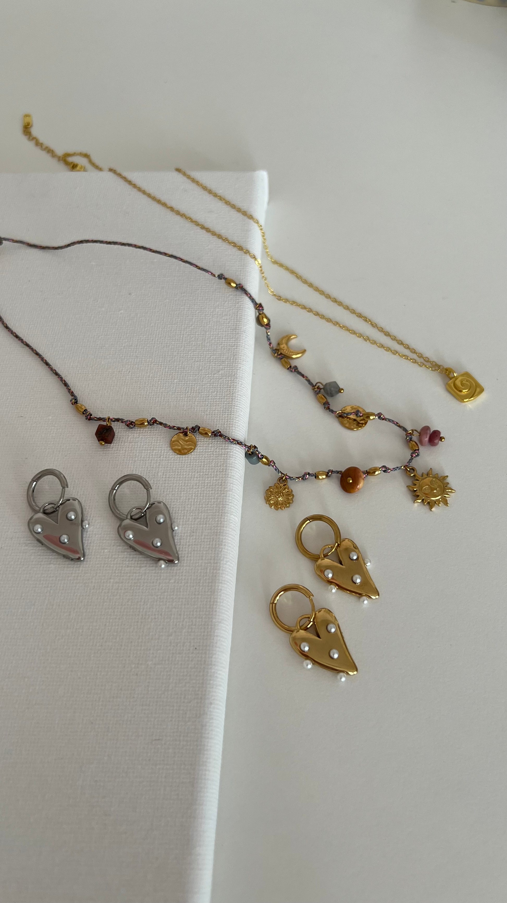 • Mix aus goldenen Plättchen, Natursteinen und Symbolanhängern für einen verspielten, boho-inspirierten Look
